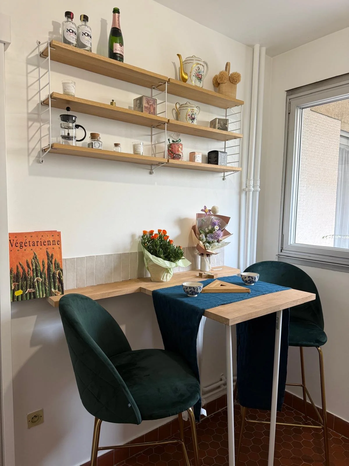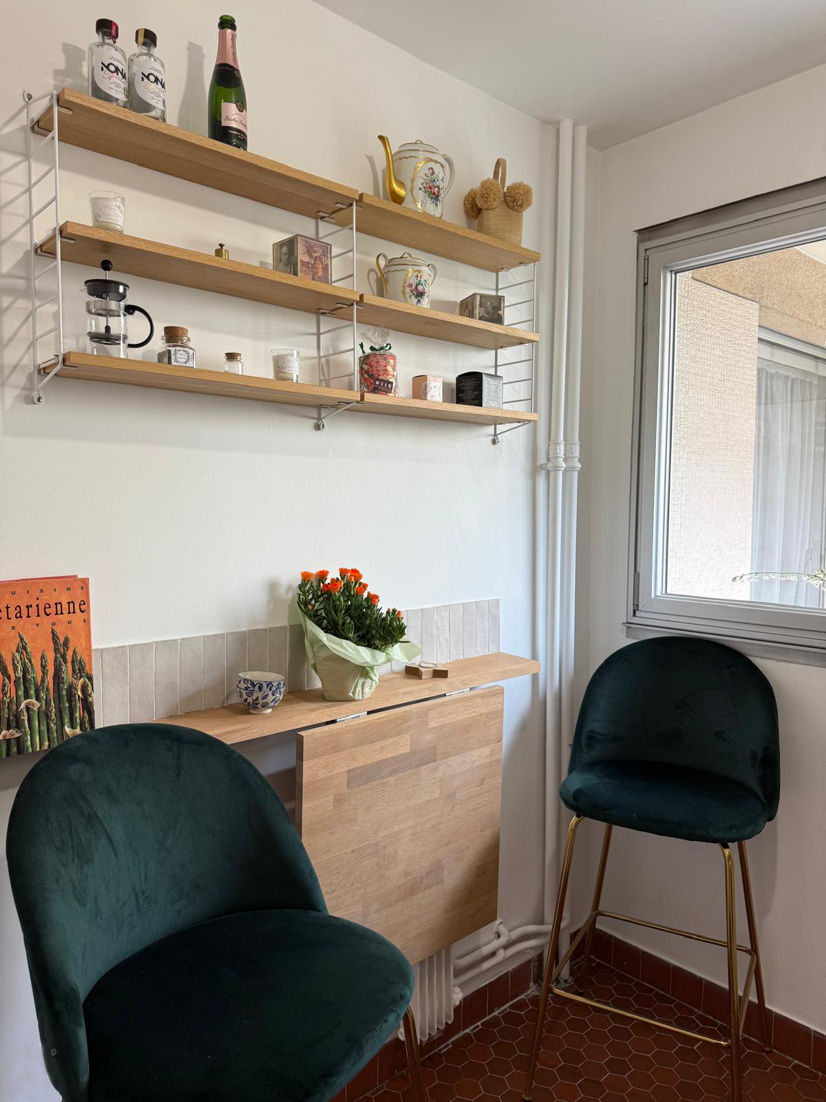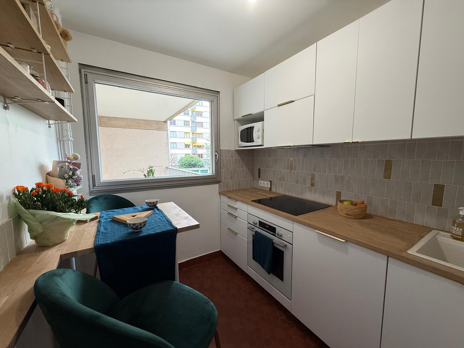 L’intervention a consisté à repenser intégralement l’espace pour en faire une cuisine contemporaine fonctionnelle, tout en minimisant les interventions : l'emplacement de l'évier reste inchangé, les tommettes au sol sont conservés, etc. Un nouveau linéaire a été conçu sur mesure pour intégrer rangements, électroménagers encastrés et surfaces de travail généreuses.